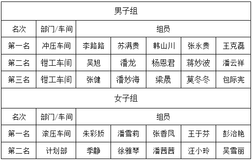 通過每次的消防演練及消防知識的培訓,不僅進一步增強了廣大員工的防范意識和自救能力,了解和掌握如何識別危險、如何采取必要的應急措施等基本操作,以便在事故中達到快速、有序、及時、有效的效果。同時為了鼓勵廣大員工能更踴躍的融入到消防演練的集體中,在此次演練評選出男子組前三名、女子組前兩名,并頒發了獎狀及獎金,以資鼓勵。獲獎名單如下: