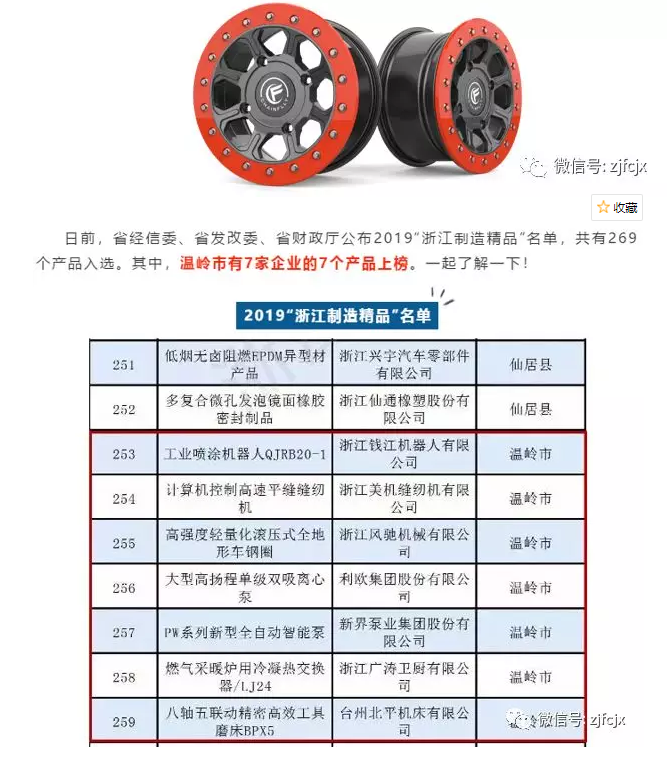為全面提升“浙江制造”品牌形象,深入推進實施“四換三名”工程,推動企業提升創新能力、品牌培育和市場開拓力度,扶持并推廣應用一批“技術先進、設計新穎、質量可靠、效益優良”的浙江制造產品,公司響應風馳于2019響應政府號召積極參與“浙江制造精品”申報,通過省經信委、省發改委、省財經廳聯合開展評選,風馳的《高強度輕量化滾壓式全地形車鋼圈》上榜入選為2019“浙江制造精品”名單,同時根據市政府鼓勵企業開發新產品的規定,公司將予以獲得30萬元的獎勵。